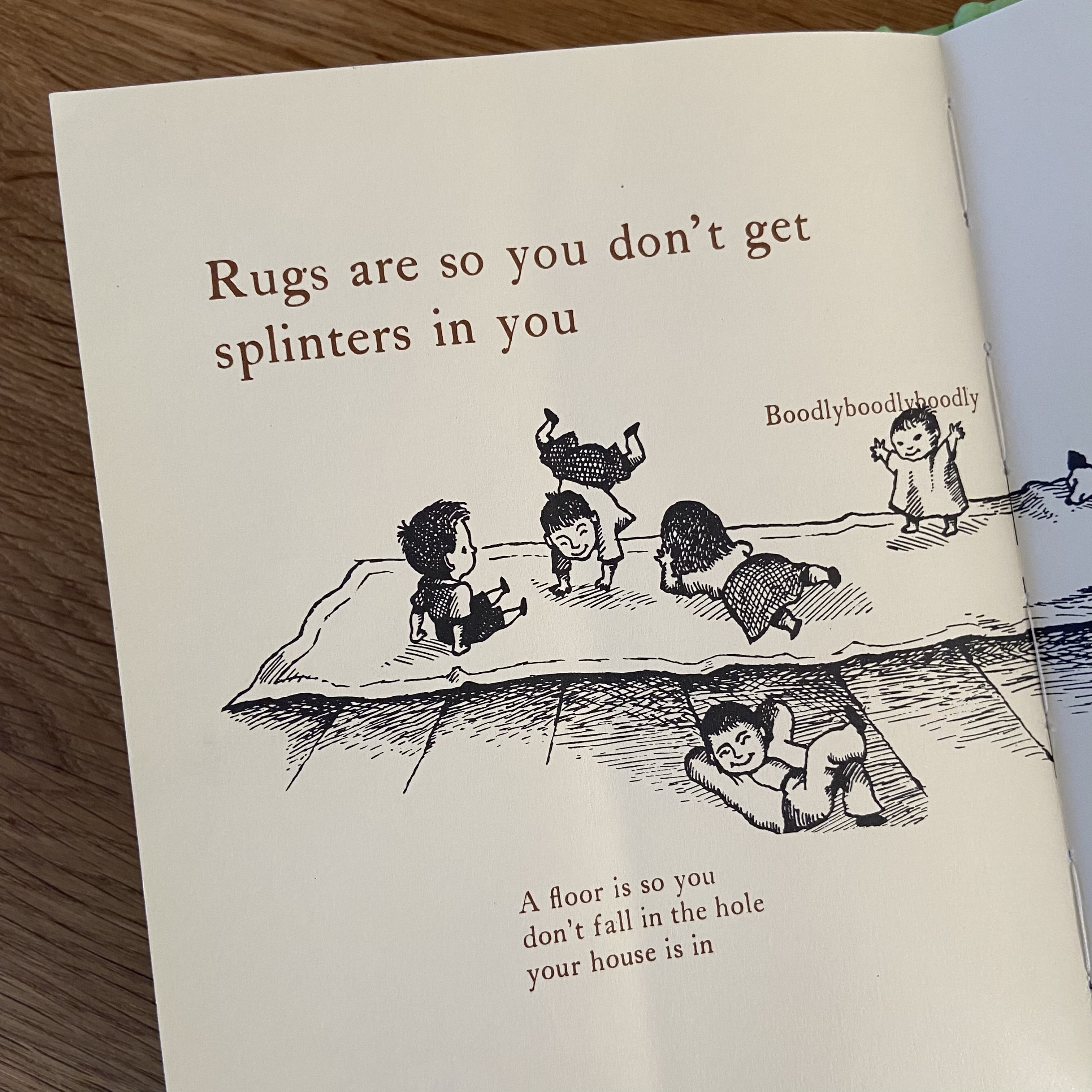 Ruth Krauss wrote this “First Book of First Definitions” in collaboration with children, who made suggestions, revisions, and additions. My current favorite: A floor is “so you don’t fall in the hole your house is in.”