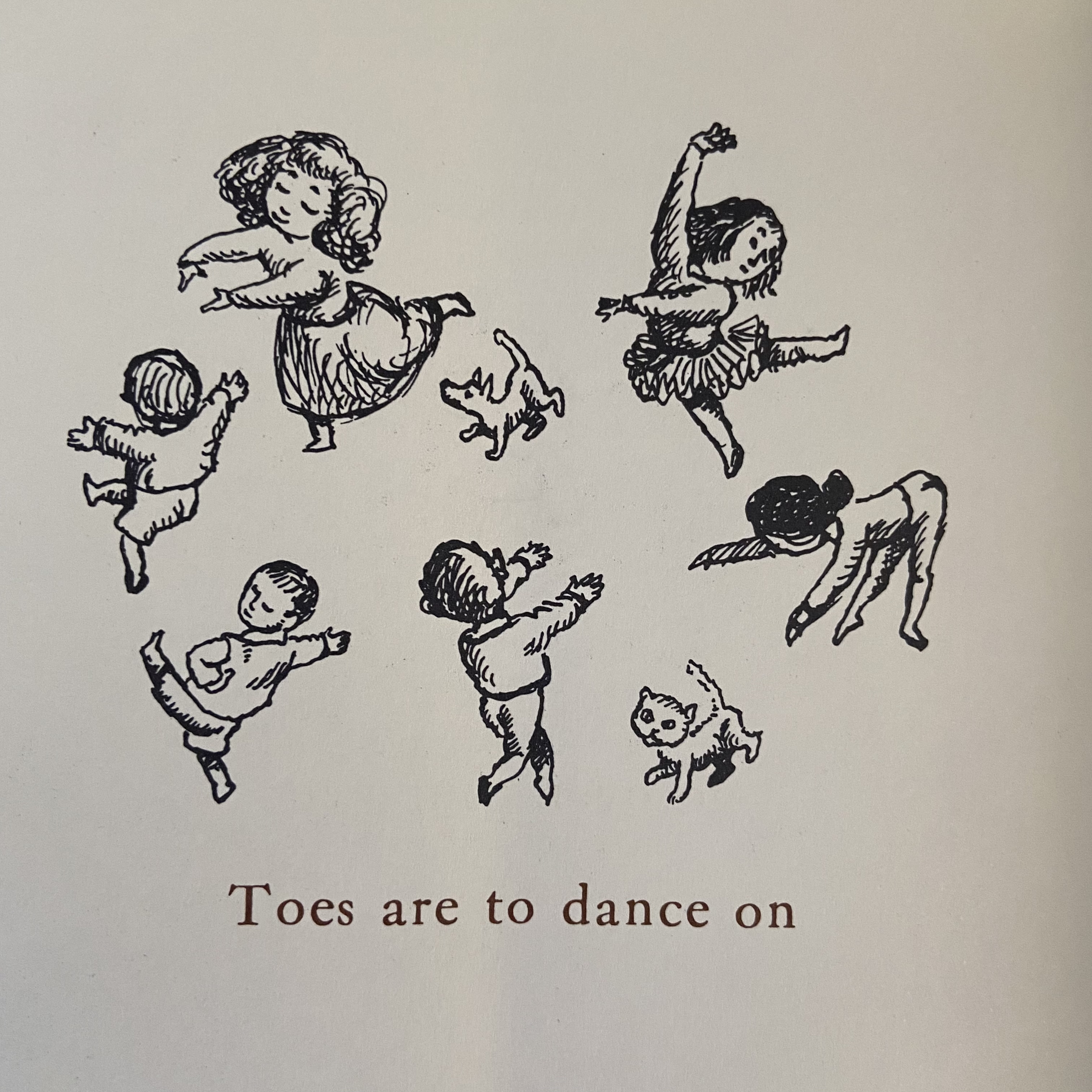 This book basically makes a movement class for you — just read, step out of the way, and see what the kids do. Maurice Sendak’ s illustrations offer endless inspiration for scrunching up noses, dancing on toeses, rolling in the snowses, planting roses, etc.