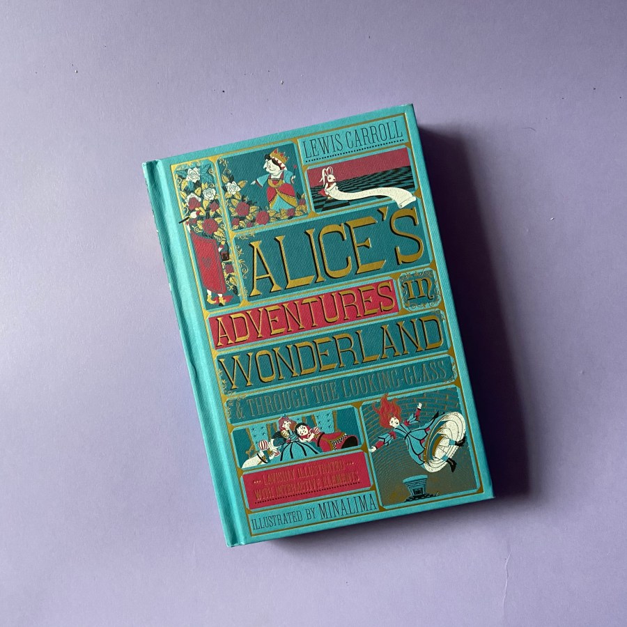 I’ve fallen in love with my new copy — it contains Alice’s Adventures in Wonderland as well as Through the Looking-Glass, “lavishly illustrated with interactive elements” by Minalima (5).